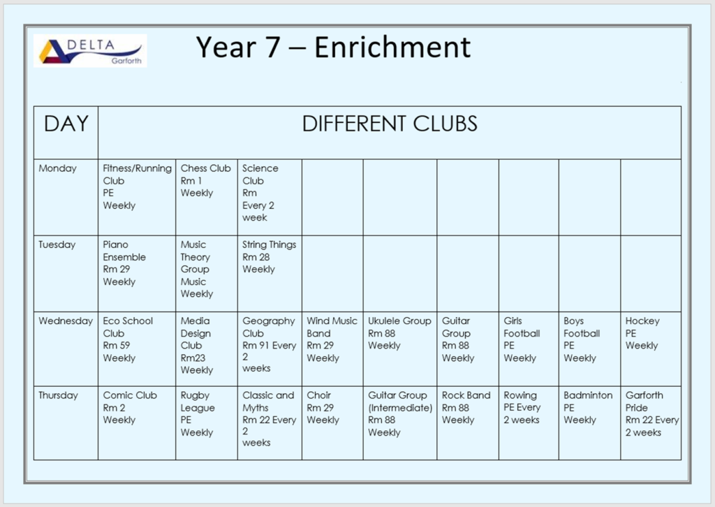 Every Friday ALL students choose an enrichment activity to be involved with. These change on a termly basis and give the students an opportunity to try a range of activities outside of their normal studies!